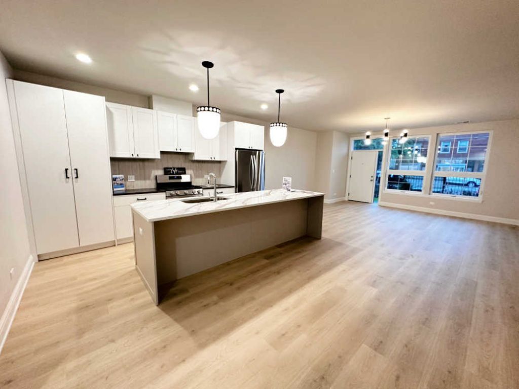 Introducing an exquisite new construction rental in Historic Bronzeville, Chicago. This stunning 3-unit building is located in the highly sought-after Bronzeville area, offering a luxurious living experience. Each unit boasts 3 spacious bedrooms and 2 bathrooms, encompassing a generous 1734 square feet of living space. Upon entering, you'll be captivated by the functional open floor plan, designed to maximize space and flow. The interior is bathed in natural light, thanks to the distinctive oversized front windows that create an inviting ambiance throughout the unit. The flawless kitchen is a true highlight, featuring gorgeous custom Marfa cabinetry that adds a touch of elegance to the space. Quartz countertops provide a sleek and durable surface, complemented by high-quality stainless steel appliances. A custom backsplash adds a unique touch, while the elegant designer lighting fixtures illuminate the culinary area. The primary suite is a show-stopper, offering an intimate retreat within the home. It boasts a spacious walk-in closet, providing ample storage for your belongings. The en-suite bathroom is a haven of relaxation, featuring an incredible shower that is sure to spoil you. Attention to detail is evident throughout the property, with custom millwork and solid 2-panel doors adding a sense of craftsmanship. The kitchen and bathroom fixtures from Moen further elevate the overall design. Bathrooms are adorned with exquisite Zellige tiles and marble floors, creating a luxurious spa-like atmosphere. Additionally, the convenience of an in-unit washer/dryer ensures a hassle-free laundry experience. Parking is a breeze with the inclusion of garage parking, providing secure and convenient storage for your vehicle. The prominent Bronzeville location offers easy access to amenities such as the Greenline Train, Mariano's grocery store, and the picturesque Lakefront. Furthermore, the property's proximity to the Loop ensures a quick commute to downtown Chicago. Don't miss the opportunity to reside in this exceptional rental property in Historic Bronzeville. Experience the perfect blend of modern luxury and historic charm in this meticulously designed 3 bed 2 bath unit.